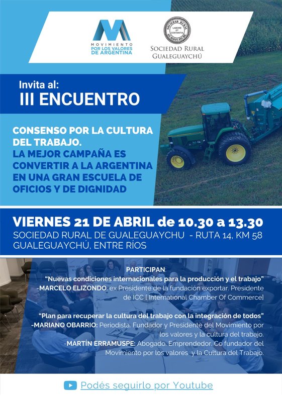 El Movimiento por los valores de Argentina y Sociedad Rural Gualeguaychú invitan este viernes 21 de abril al III Encuentro : "Consenso por la Cultura del Trabajo".