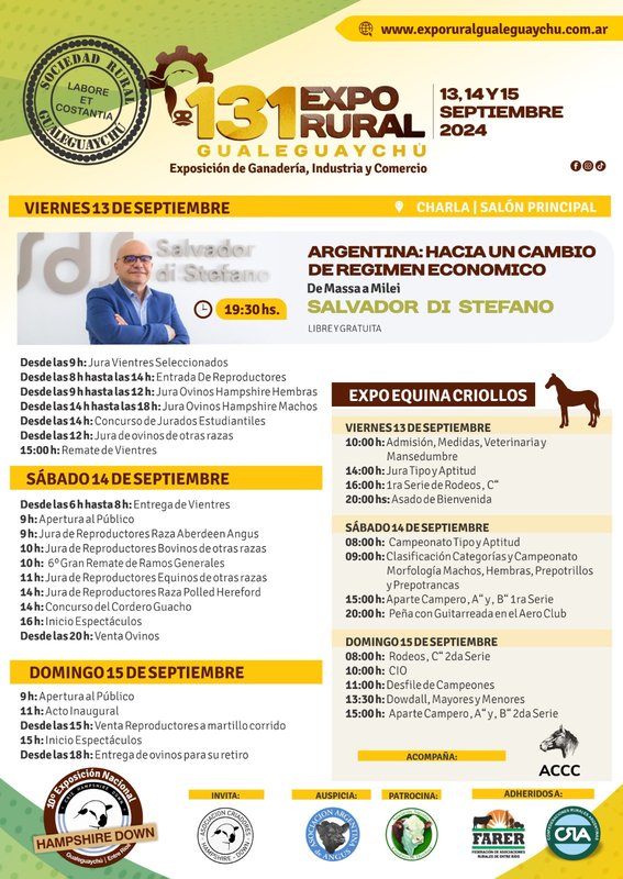 De Massa a Milei”, a cargo del prestigioso economista Salvador Di Stefano. Viernes 13 a la hora 19:30. Entrada libre y gratuita. 13° Concurso de Vientres, las tradicionales juras de reproductores ovinos y bovinos (Hereford y Aberdeen Angus) y los remates correspondientes.