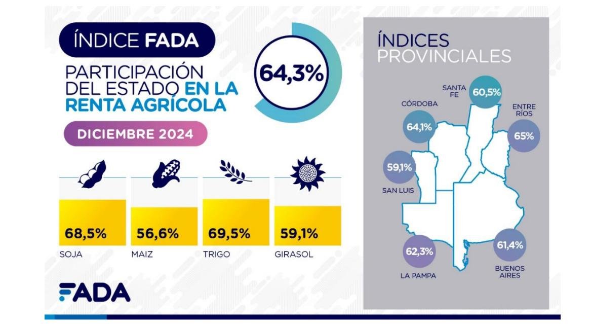 ● Trigo: Promedio histórico de 28,4 qq/ha, mientras que el rendimiento de indiferencia es de 36,6 qq/ha, generando una pérdida estimada de 8,2 qq/ha. A esto se suma el informe de FADA, que indica que el Estado (en sus niveles nacional, provincial y municipal) retiene el 65% de la renta agrícola de los productores entrerrianos, el porcentaje más alto del país. Este indicador supera al promedio nacional, que se ubica en 64,3%, y refleja un aumento de 2,8 puntos respecto al último relevamiento de septiembre y de 5,4 puntos en comparación con diciembre de 2023.