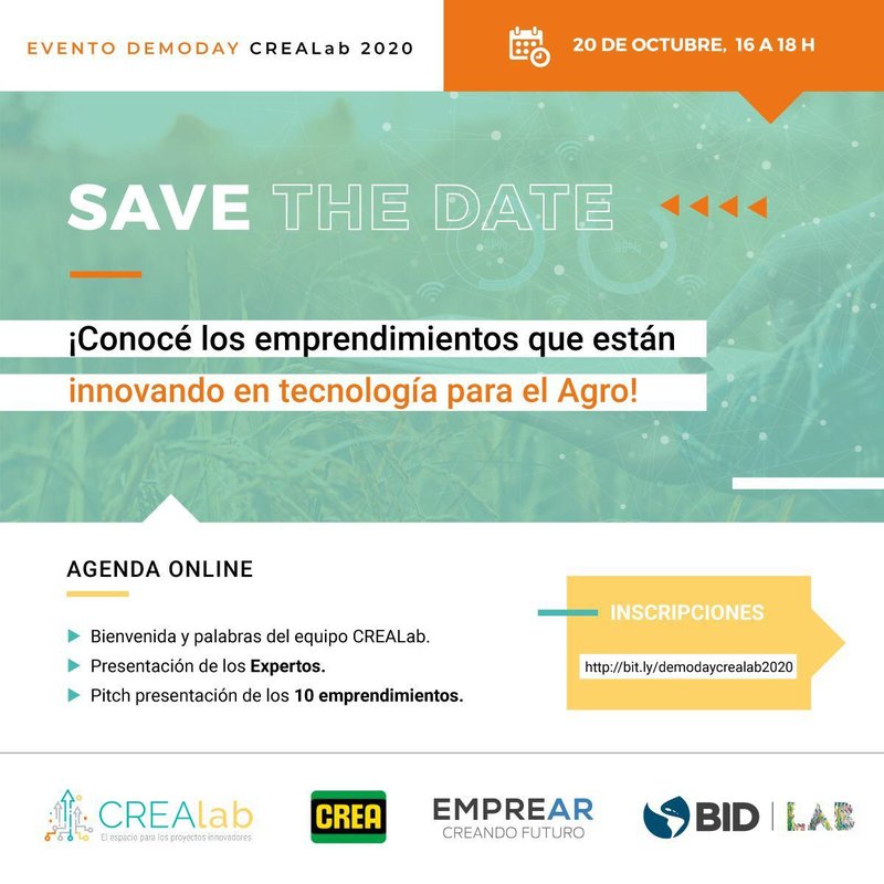 La jornada CREAlab ,que este año fue totalmente virtual, es organizada por el área de Innovación de la Asociación Argentina de Consorcios Regionales de Experimentación Agrícola (CREA) y EMPREAR. Forma parte del programa de incubación del Movimiento CREA cuyo propósito es consolidar el desarrollo de empresas de base tecnológica que ofrezcan soluciones para los problemas y desafíos del sector agroalimentario. El objetivo es poner a disposición de los emprendedores una red de soporte técnico-empresarial y una amplia gama de recursos para probar, validar y desarrollar sus propuestas de valor y planes de negocios. En esta instancia, las instituciones organizadoras buscan visibilizar los proyectos incubados para ampliar sus redes de contactos.
